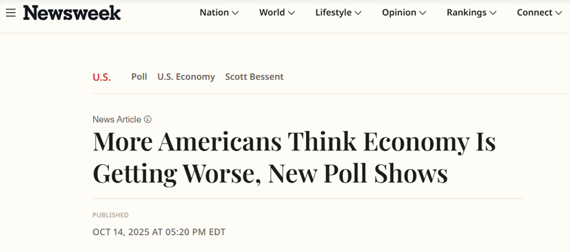 【环球网财经综合报道】北京时间10月15日凌晨,美联储主席鲍威尔暗示,美联储官员们可能在未来几个月停止收缩 资产负债表,他承认货币市场出现了紧缩的"一些迹象"。 鲍威尔还表示,自9月FOMC货币政策会议以来,通胀和就业前景似乎变化不大,不过他强调,劳动力市场出现越来越 多的疲软迹象。他还暗示,即使政府停摆严重削弱了美联储对经济形势的掌握程度,但仍有望在本月晚些时候再次降 息25个基点。 英国《新闻周刊》日前发文称,经济学家YouGov的一项调查发现,受访的18%美国成年人认为经济正在改善,21%认 为大致不变,而认为经济恶化的比例为57%,4%的人感到不确定;57%的美国人认为美国经济正在恶化,这是自2024 年以来的最高比例。 《新闻周刊》认为这一数据反映了公众对政府关门、通胀忧虑和党派分歧的担忧。经济减速、消费者信心下降、裁 员、高通胀和贸易战等多重因素影响了经济前景,尤其是中低收入群体承受压力增大。 该报道还提到,尽管美联储降息,但如果不确定性和裁员继续,经济复苏面临挑战。政府关门和升高物价问题仍未得 到有效解决,可能进一步加剧公众的悲观情绪。 ...