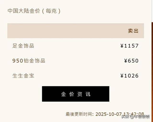 周生生足金饰品今天标价1157元/克,比昨天涨了16块。一条50克的项链,一夜之间贵出800元。 国内主流品牌今天全线跟涨:周大福、六福、潮宏基统一挂到1155元,老庙和老凤祥略低一点,1151 元。对比昨天周生生1141元的报价,单日涨幅1.4%。这不只是年内新高,也是国内金饰价格的历史峰 值。 这波涨势来得又快又猛。有做珠宝批发的朋友说,今早部分门店干脆暂停大额金条销售,怕价格继续往 上冲,库存扛不住。连商家都措手不及,更别说普通消费者。 国际金价是导火索。纽约商品交易所的黄金期货突破4000美元/盎司,史上头一回。按汇率和税费折 算,光原料成本就逼近580元/克,国内足金饰品卖到1150元以上,溢价接近一倍。品牌溢价、加工费、 消费税,一层层叠上去,最后落到消费者头上。 第三,央行还在买。世界黄金协会最新报告显示,2025年前三季度,全球官方黄金储备净增867吨,新 兴市场央行占了七成以上。中国央行已连续18个月增持黄金,虽然没公布具体数字,但外汇储备里的黄 金占比确实在稳步上升。 这不是短期炒作。结构性资金在长期配置,金价的支撑比过去更硬。 但对普通人来说,账算得越来越疼。2020年这时候,足金才40 ...