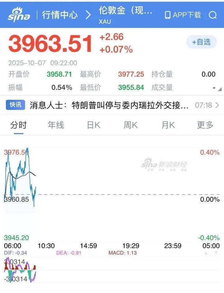 国庆长假期间,海外资本市场"精彩不断"。最受人关注的是,受美国政府"停摆"闹剧影响,伦敦现货黄 金价格10月7日上午已经升破3960美元/盎司关口,最高触及3977.25美元/盎司,纽约期货黄金价格盘中 首次突破4000美元/盎司,再度刷新历史新高。 | sma 行情中心 > ■ APP下载 Q XAU | | 伦敦金(现 ... | | --- | --- | --- | | +自洗 3963.51 +2.66 | | | | 2025-10-07 09:22:00 3977.25 持仓量 0.00 | 开盘价 3958.71 最高价 | | | 振幅 3955.84 成交量 | 0.54% 最低价 | | | 快讯 消息人士:特朗普叫停与委内瑞拉外交接 ... 07:18 > | | | | 分时 年线 日K 更多 周K | | | | 3076.5 0.40% | | | | 0.00% | | | 与此同时,海外股市在"十一"期间普遍走高。其中,日经225指数6日大涨超过4%;港股在四季度首个 交易日(10月2日)同样强势上涨,当日恒生指数上涨1.61%(6日则下跌0.67%),收报27187.12点 ...