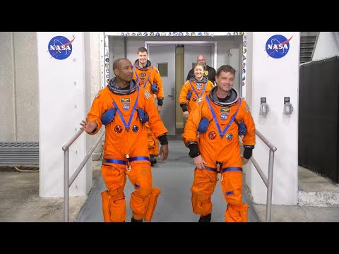 For a moon rocket this massive, this is what one small step looks like. At Kennedy Space Center, the 3 and 12 million pound rocket and crew capsule rolled out a top an Apollo era crawler inching four miles from the assembly building to the launch pad. There to watch the four astronauts who will soon go back to the moon.>> What's going through your mind. >> Don't screw it up. ...