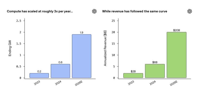 近日,OpenAI官网放出了其首席财务官Sarah Friar与传奇投资人、Khosla Ventures创始人Vinod Khosla的深度对话。 针对AI泡沫担忧,Vinod明确表示,用股价波动来衡量泡沫是错误的,真正的衡量标准应当是底层的实际使用量:在互 联网时代是流量,在AI时代则是API调用量。目前的API调用量完全看不到任何泡沫的迹象,现状并非需求不足,而是 供给受限。 Sarah Friar佐证了这一观点,她首次详细披露了OpenAI过去三年的增长数据: 2023年:算力规模约200兆瓦,ARR约20亿美元。 2024年:算力规模增长至600兆瓦,ARR增长至60亿美元。 2025年:算力规模突破2吉瓦(即2000兆瓦),ARR超过200亿美元。 数据显示,OpenAI的算力投入与商业回报之间呈现出近乎完美线性的关系,这种高度耦合的增长曲线表明,AI产业仍 处于典型的供给侧约束阶段。现在需求上限仅受制于算力的可用性。如果今天有更多的算力,OpenAI就能推出更多的 产品,训练更多的模型。 虽然算力投入与回报在曲线上是对应的,但时间上存在错配。Sarah坦言,为了确保2028年至2030年的算力供 ...