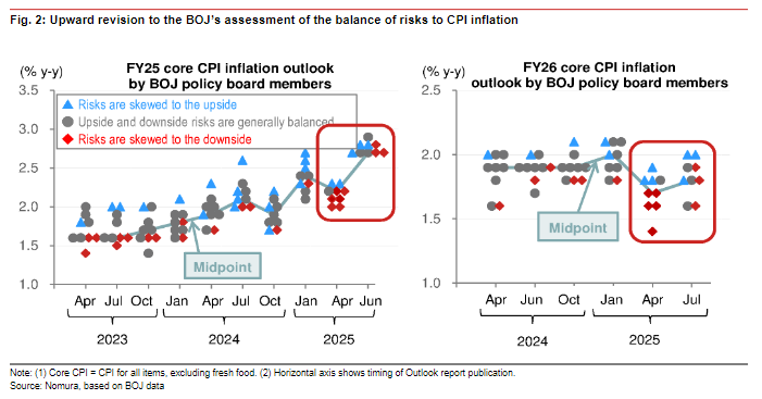 据追风交易台消息,巴克莱银行和野村证券在最新发布的研报中认为,日本央行的政策立场正在转向更加鹰派。巴克莱将日央行下次加息的预期时点从明 年1月提前至今年10月,野村则将10月加息的概率从30%上调至40%。 通胀粘性超预期,为下次加息打开大门 与4月时因担忧关税影响而大幅下调增长预期的立场不同,日央行此次显著上调了对2025财年的实际GDP增长预测,以及对2025-26财年的CPI通胀预测。 日本央行"放鹰",10月加息大门已经敞开。 日本央行昨日公布最新利率决议,维持政策利率在0.5%不变,但全面上调了2025财年至2027财年的核心CPI通胀预测,还将对通胀风险的评估从之前 的"倾向于下行"调整为"总体均衡"。 分析指出,这一系列调整暗示日本央行已承认通胀的强劲势头,虽行动上看似滞后,但已在为加息做准备。 该行在报告中表示,这项调整的直接原因是美日关税协议的达成,将有效平均关税税率从24.5%降至15.6%,缓解了对企业利润的下行压力。此外,央行 将通胀前景的风险评估从4月的"偏向下行"调整为"总体平衡",并将贸易政策的不确定性描述从"极高"降至"高"。 巴克莱分析指出,日央行上调通胀预期的举动,实质上是 ...