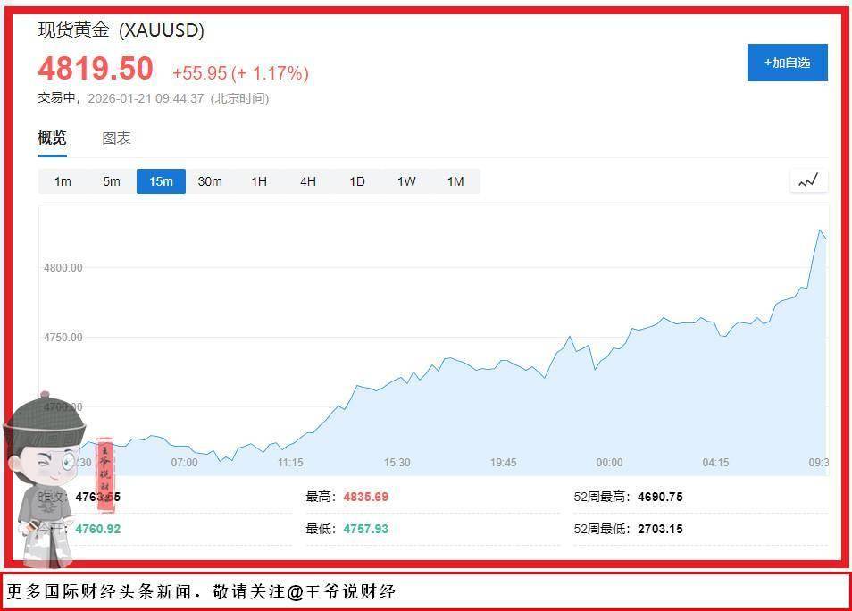 你敢信吗?就在刚刚,国际金价像坐了火箭一样,直接冲破了4800美元/盎司的大关! 注意了!这不是演习,这是真正的历史时刻。北京时间1月21日早盘,现货黄金根本不带回调的,一头猛扎进去,最高飙到了4836美元。 这可是人类历史上的头一遭!年内涨幅直接干到了10%,这才刚开年几天啊? 什么情况?这世界是要变天了吗?为什么在美联储还没降息的时候,黄金就跟打了鸡血一样狂奔?咱们老百姓手里的钱,接下来该往哪儿放? 王爷说财经讯:再次见证历史!金价刷新历史新高,黄金冲上4800美元大关! 今天,咱们就把这个"疯狂金价"的底裤给它扒干净,看看到底是谁在背后推波助澜! 01、黄金突破4800美元背后:三把火烧穿了天花板! 黄金这一波暴涨,绝对不是空穴来风,而是三记重锤砸出来的"深坑反弹"。 第一锤,特朗普的"嘴炮"引发了恐慌。 就在1月20 日,特朗普再次放话:拿下格陵兰岛势在必行,如果不把格陵兰岛给他,就要对欧洲八国加征关税,甚至还要对法国的香槟和葡萄酒收200%的 重税! 这哪是做生意,这简直是明抢啊! 美欧局势瞬间剑拔弩张,资本市场吓得魂飞魄散,美股、美债、美元汇率直接来了个"三杀"。资金为了保命,只能往一个地方钻—— ...