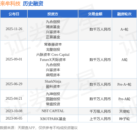 Core Insights - Changzhou Laimu Technology Co., Ltd. has completed an A+ round of financing, raising tens of millions of RMB, with investors including Jiuhe Venture Capital, Qingbo Fund, Xingfu Capital, and Zhengjing Fund [1][2]. Financing Details - The A+ round financing occurred on November 26, 2025, with participation from multiple investment firms [2]. - Previous financing rounds include: - A round on September 1, 2025, also raising tens of millions of RMB, with investors such as Ivy Capital, Gobi Partners, and others [2]. - Pre-A+ round on June 29, 2025, and Pre-A round on April 21, 2025, both raising tens of millions of RMB [2]. - Angel round on October 8, 2023, raising millions of RMB [2]. - Seed round on June 5, 2023, raising over ten million RMB [2]. Company Overview - Laimu Technology is a startup focused on courtyard robots, incubated by the XbotPark Robotics Base, primarily targeting the European and American markets [1][2]. - The founder previously served as the R&D director for SharkNinja, achieving a second-place market share for vacuum robots in North America [2]. - The team, established in early 2022, has extensive experience in product design, development, and sales, with members holding advanced degrees from prestigious universities and having worked at leading companies in the robotics and AI sectors [1][2].