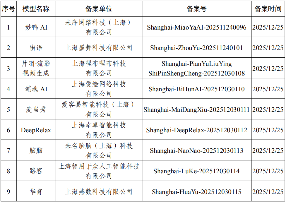 | 序号 | 模型名称 | 备案单位 | 备案号 | 备案时间 | | --- | --- | --- | --- | --- | | 1 | 妙鸭 AI | 未序网络科技(上海) | Shanghai-Miao YaAI-2025 11240096 | 2025/12/25 | | | | 有限公司 | | | | 2 | 宙语 | 上海墨舞科技有限公司 | Shanghai-Zhou Yu-202511240101 | 2025/12/25 | | 3 | 片羽·流影 | 上海哩布哩布科技 | Shanghai-Pian YuLiu Ying | 2025/12/25 | | | 视频生成 | 有限公司 | ShiPinShengCheng-202512030108 | | | 4 | 笔魂 AI | 上海爱绘网络科技 | Shanghai-BiHunAI-202512030110 | 2025/12/25 | | | | 有限公司 | | | | 5 | 麦当秀 | 爱客易智能科技(上海) | Shanghai-MaiDangXiu-202512030111 2025/12/25 | | | | | 有 ...
