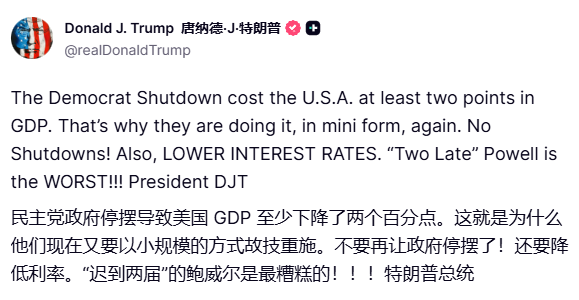 美国总统特朗普:政府停摆冲击经济,呼吁美联储降息