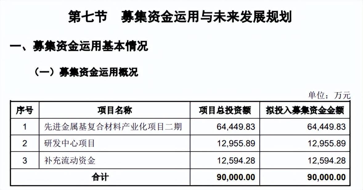 12月12日,有研金属复合材料(北京)股份公司(有研复材)科创板上市成功过会,保荐机构是中信证券。 有研复材主要从事金属复合材料及制品、特种有色金属合金制品的研发、生产和销售主要产品包括金属基复合材料及制品、双金属复合材料及制品、特种铝 合金制品和特种铜合金制品等,公司产品广泛应用于航空航天、军工电子、智能终端、家用电器等领域。 据短平快解读了解,本次IPO,有研复材拟公开发行不超过1.59亿股,拟募集资金9亿元,用于先进金属基复合材料产业化项目二期、研发中心项目、补充流 动资金项目,拟投入募集资金分别为6.44亿元、1.3亿元、1.26亿元。 | 序号 | 项目名称 | 项目总投资额 | 拟投入募集资金金 | | --- | --- | --- | --- | | 1 | 先进金属基复合材料产业化项目二期 | 64.449.83 | 64.449.8 | | 2 | 研发中心项目 | 12,955.89 | 12,955.8 | | 3 | 补充流动资金 | 12,594.28 | 12,594.2 | | | 合计 | 90,000.00 | 90,000. | 上半年产能利用率下滑,产能消化要引起关注。 ...