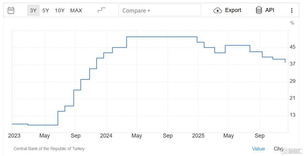 Group 1 - The Central Bank of Turkey lowered the policy interest rate by 150 basis points from 39.5% to 38% on December 11 [1] - The decline in food prices led to a lower-than-expected inflation rate in November, with a slight decrease in the inflation trend observed in October and November [1] - The Central Bank noted that the GDP growth rate in the third quarter exceeded expectations, indicating sustained demand conditions to support the anti-inflation process [1] Group 2 - The annual inflation rate in Turkey fell from 32.87% in October to 31.07% in November, marking a four-year low and below market expectations [2] - The Central Bank acknowledged improvements in inflation expectations and pricing behavior, but still identified risks to the anti-inflation process [1] - The Central Bank aims to maintain a tight monetary policy stance until price stability is achieved, targeting a mid-term inflation goal of 5% [1]