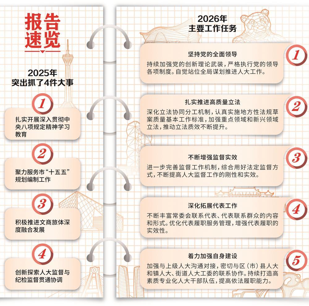 依法履职 务实担当 不断丰富拓展全过程人民民主的成都实践 转自:成都日报锦观 ——市人大常委会工作报告亮点解读 1月29日,在市十八届人大四次会议第二次全体会议上,代表们听取了市人大常委会工作报告。 报告指出,在市委的坚强领导下,市人大常委会坚持以习近平新时代中国特色社会主义思想为指导,深入贯彻党的二十大和二十届历次全会精 神,全面学习贯彻习近平总书记在庆祝全国人民代表大会成立70周年大会上的重要讲话精神,认真落实党中央和省委、市委决策部署,坚持党 的领导、人民当家作主、依法治国有机统一,扎实做好立法、监督、代表等工作,切实加强"四个机关"建设,不断丰富拓展全过程人民民主的 成都实践,圆满完成市十八届人大三次会议确定的目标任务,为全市经济社会高质量发展作出了积极贡献。 提升立法质量 持续优化超大城市法治供给 报告指出,常委会坚持和完善"党委领导、人大主导、政府依托、各方参与"立法工作格局,不断创新立法工作制度、完善立法工作机制,注 重"小切口""小快灵"立法,着力夯实成都现代化建设法治支撑。 聚焦建设创新成都加强立法。制定智慧蓉城促进条例,推动建立数字化城市管理服务体系,修改优化营商环境条例,进一步激发市场活 ...
