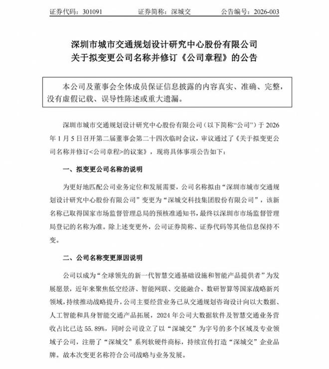 近日,深圳国资旗下上市公司深城交(301091.SZ)发布公告,公司召开第二届董事会第二十四次临时 会议,审议通过《关于拟变更公司名称并修订<公司章程>的议案》。公司拟将"深圳市城市交通规划设 计研究中心股份有限公司"变更为"深城交科技集团股份有限公司",新名称已取得国家市场监督管理总 局预核准。 采写:南都湾财社 记者 邱墨山 关于变更原因,深城交称,本次更名旨在更好匹配公司业务定位和发展需要。公开资料显示,作为2021 年在深交所创业板上市的国内首个国资控股城市交通整体解决方案企业,深城交近年来业务结构已发生 根本性转变,从传统交通规划咨询设计,全面拓展至以大数据、人工智能和具身智能为核心的交通科技 产品领域。 财务数据印证了深城交的转型成效。2024年,公司大数据软件及智慧交通业务营收占比已达55.89%, 科技相关业务已成为公司核心收入来源。2024年全年新签合同额达25.8亿元,同比增长49%,其中低空 经济、智能网联等新质业务占比超67%,同比激增138%,成为业绩增长的核心引擎。 同时,深城交表示,公司品牌体系建设日趋完善,已设立多个以"深城交"为字号的区域及专业领域子公 司,注册"深城交"系列 ...