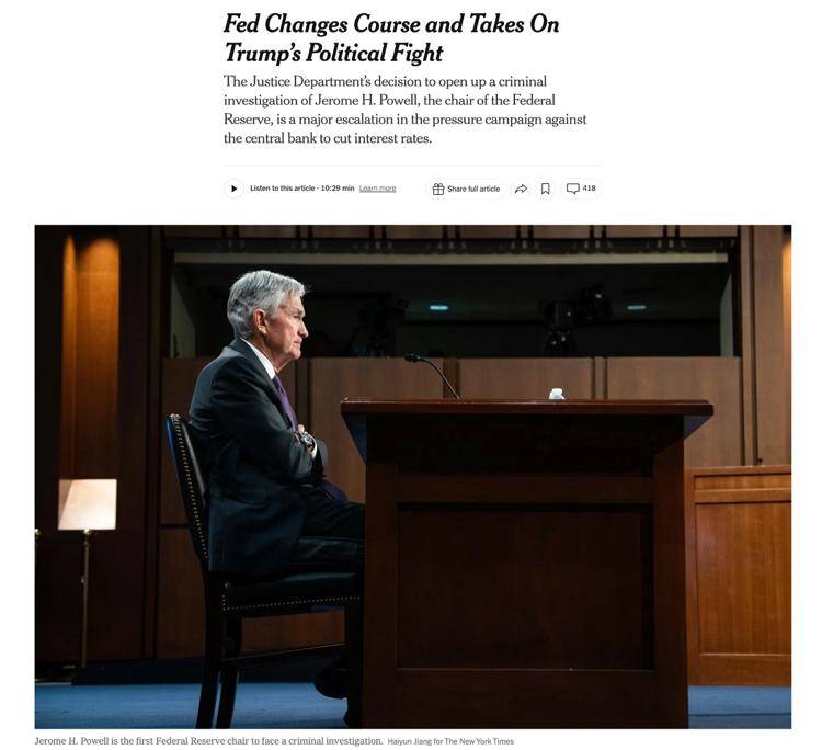 当地时间1月12日,围绕美联储主席鲍威尔"被调查"的消息几乎占据了美国各大媒体的显著位置:表面上只是关乎一项联储大楼翻修工 程,但却迅速牵动到更敏感的问题——司法检控是否正在被用来影响货币政策的独立裁量? 最新的两条消息把对这一事件的关注高度推到了峰值。据披露,财政部长贝森特私下向特朗普直言此事"造成混乱",可能伤及金融市 场;而白宫随即强调,总统并未指示司法部启动调查。两种口径一前一后,使舆论焦点也从"查不查"转向了"谁在指挥、边界在哪"。 这场风暴名义上的起点,是美联储华盛顿总部历史建筑翻修项目及其预算与配置争议。日前,司法部围绕联储总部翻修项目与其国会 证词"是否存在不一致之处"展开调查,向美联储送达大陪审团传票,并引发外界对潜在刑事指控的联想。结果,鲍威尔1月11日夜罕见 发布视频,公开反击,否认存在不当行为,指出相关指控"不过都是借口",之所以对联储发出刑事指控威胁,主要就是因为美联储按 专业判断设定利率,"而不是一味迎合总统意愿"。 美国多家媒体认为,这是特朗普政府与鲍威尔长期冲突(尤其围绕降息节奏与幅度)的一次"明显升级"。舆论分析认为,这场冲突之所 以迅速扩散,不在于工程审计有多复杂,而在于" ...