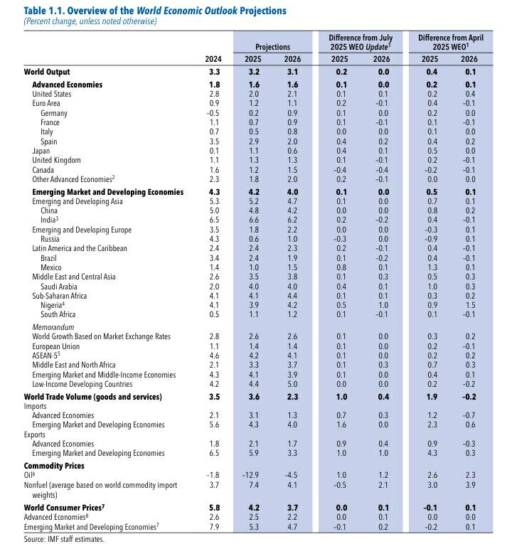 | | | | | Difference from July | | | Difference from April | | --- | --- | --- | --- | --- | --- | --- | --- | | | | Projections | | 2025 WEO Update1 | | | 2025 WEO1 | | | 2024 | 2025 | 2026 | 2025 | 2026 | 2025 | 2026 | | World Output | 3.3 | 3.2 | 3.1 | 0.2 | 0.0 | 0.4 | 0.1 | | Advanced Economies | 1.8 | 1.6 | 1.6 | 0.1 | 0.0 | 0.2 | 0.1 | | United States | 2.8 | 2.0 | 2.1 | 0.1 | 0.1 | 0.2 | 0.4 | | Euro Area | 0.9 | 1.2 | 1.1 | 0.2 | -0.1 | 0.4 | -0.1 | | Germany | -0.5 | 0.2 | 0.9 | 0.1 | 0.0 | 0.2 | ...