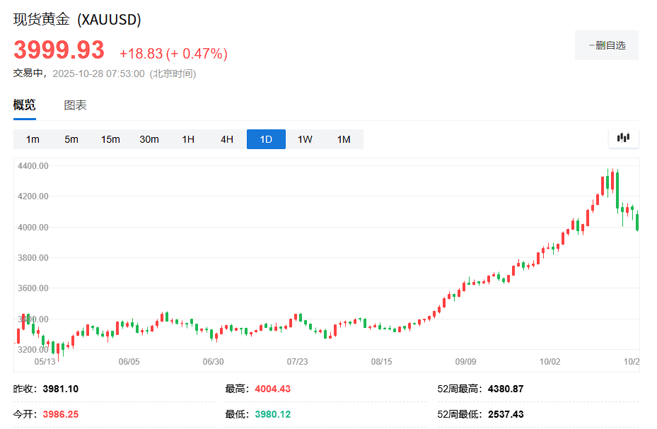 Group 1 - The core viewpoint of the article is that gold prices have recently fallen below $4000 per ounce, marking a significant decline after reaching a historical peak of $4390 per ounce on October 17. This decline is attributed to technical corrections and profit-taking by investors [1][2]. - The recent drop in gold prices has been ongoing for nearly a week, with a notable decline starting on October 21. The market has experienced high volatility since then [1]. - Analysts suggest that the extreme market conditions are due to an overcrowded long position in gold, which has led to profit-taking as investors seek to realize gains [1]. Group 2 - Despite the recent price drop, analysts believe that the long-term upward trend for gold remains intact, supported by ongoing monetary easing and expectations of further interest rate cuts by the Federal Reserve [2]. - Global central banks have continued to purchase gold at a significant rate, averaging over 1000 tons per year since 2022, which provides a stable demand foundation for gold [2]. - The demand for gold as a safe-haven asset remains strong due to various global uncertainties, reinforcing its value in investment portfolios [2].