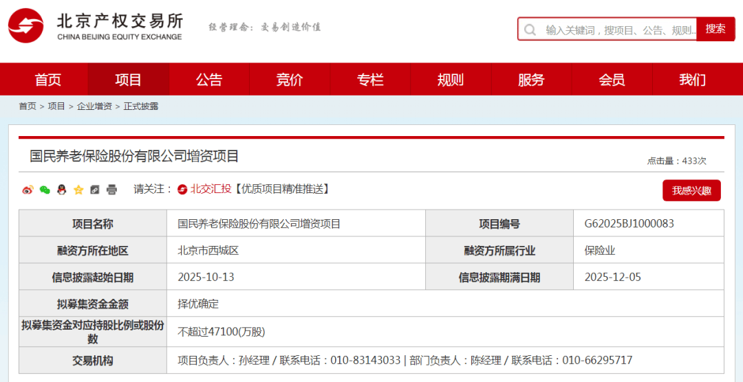 根据公告,意向投资方须为中国境内(不含港澳台地区)依法注册并有效存续的企业法人,除须符合《保险公司股权管理办法》等国家法律法规、监管规 定对保险公司相应类别股东资质的相关要求,还应具有良好的财务状况、支付能力、商业信誉和市场信用。 具体而言,意向投资方自身或其控股股东或其实际控制人净资产不低于10亿元,最近一个会计年度盈利;须以自有资金参与本次增资且出资来源合法,并 非使用银行贷款及其他形式的非自有资金,不存在委托持股、资产管理计划和信托计划等情形;最近三年无重大违法违规及失信等不良记录。 专业养老险公司上演增资"接力赛"。 10月13日,国民养老保险股份有限公司(下称"国民养老")增资项目在北京产权交易所正式披露,拟征集投资方数量不超过5个,拟募集资金对应持股比 例或股份数不超过4.71亿股,用于补充一级核心资本,支持主营业务发展。 | 北京产权交易所 CHINA BEIJING EQUITY EXCHANGE | | 经营理念:灵易创造价值 | | | | | Q 输入关键词,搜项目、公告、规则.. | 捜索 | | --- | --- | --- | --- | --- | --- | --- | -- ...