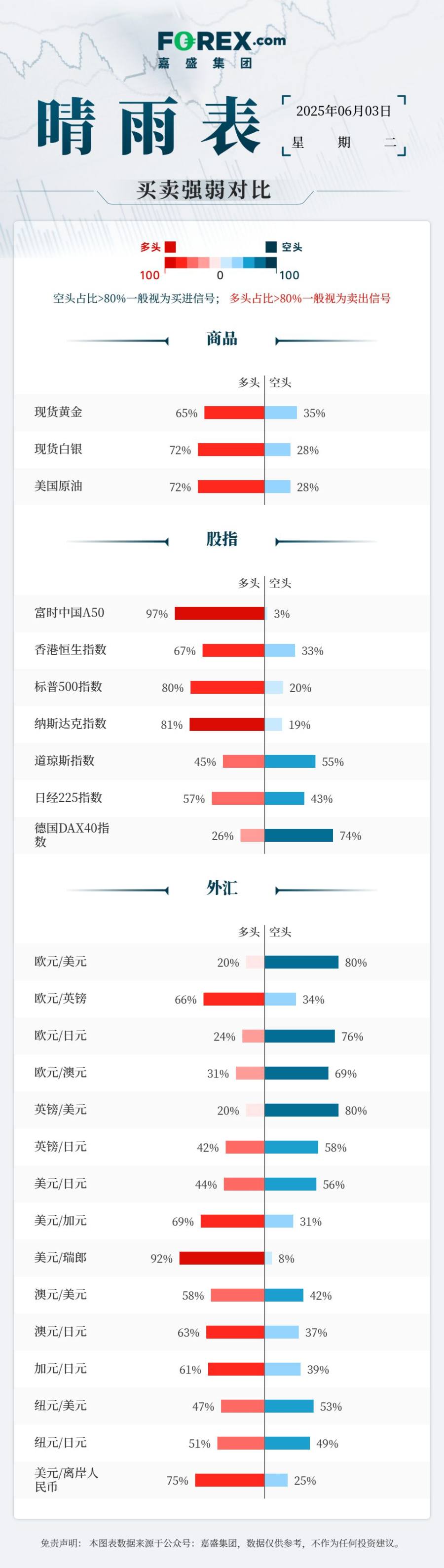 电话.1 7 / 70 JY0 香港恒生指数 33% 67% 标普500指数 20% 80% 纳斯达克指数 81% 19% 道琼斯指数 55% 45% 日经225指数 57% 43% 德国DAX40指 74% 26% 数 外汇 r 多头 空头 欧元/美元 20% 80% 欧元/英镑 34% 66% 欧元/日元 24% 76% 欧元/澳元 31% 69% 英镑/美元 20% 80% 英镑/日元 42% 58% 美元/日元 44% 56% 美元/加元 31% 69% 美元/瑞郎 97% 8% 澳元/美元 42% 58% 澳元/日元 37% 63% 加元/日元 39% 61% 纽元/美元 53% 47% 纽元/日元 49% 51% 美元/离岸人 75% 25% 民币 免责声明:本图表数据来源于公众号:嘉盛集团,数据仅供参考,不作为任何投资建议。 地缘政治风险和关税引发的不确定性推动金价走高,黄金多头情绪增强,短期看涨势头较为显著。欧佩克+继续大幅增产政策, 但加拿大产油省面临野火威胁,美油目前多头情绪较为占优。欢迎前往"数据库-嘉盛市场晴雨表"查看并订阅(数据每10分钟更 新1次) ...