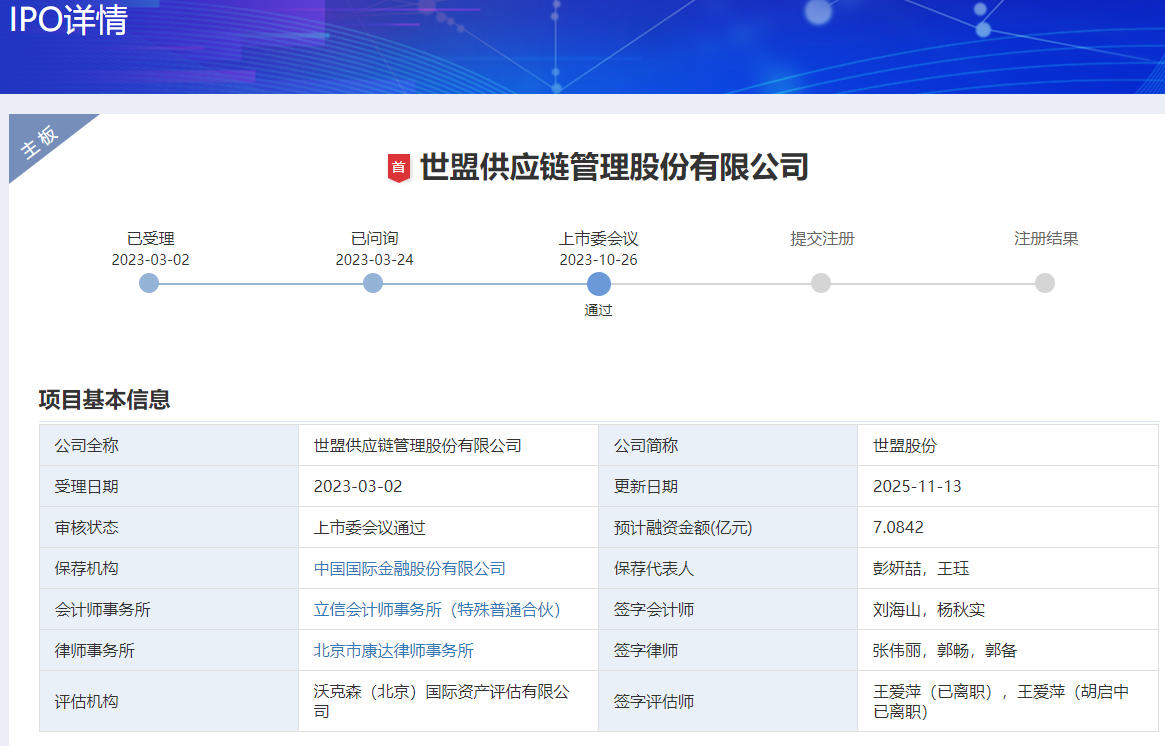 来源:上海证券报·中国证券网 上证报中国证券网讯 11月13日,深交所官网显示,世盟供应链管理股份有限公司(简称"世盟股份")于11月13日更新提交相关财务资料。 上市进程显示,2023年10月26日,世盟股份IPO获深交所上市委会议通过。重要节点为:2023年3月2日已受理,2023年3月24日已问询,2023年10月26日上 市委会议通过。(王新昌) | 公司全称 | 世盟供应链管理股份有限公司 | 公司简称 | 世盟股份 | | --- | --- | --- | --- | | 受理日期 | 2023-03-02 | 更新日期 | 2025-11-13 | | 审核状态 | 上市委会议通过 | 预计融资金额(亿元) | 7.0842 | | 保荐机构 | 中国国际金融股份有限公司 | 保存代表人 | 彭妍喆,王珏 | | 会计师事务所 | 立信会计师事务所(特殊普通合伙) | 签字会计师 | 刘海山,杨秋实 | | 律师事务所 | 北京市康达律师事务所 | 签字律师 | 张伟丽,郭畅,郭备 | | 评估机构 | 沃克森(北京)国际资产评估有限公 司 | 签字评估师 | 王爱萍(己离职),王爱萍(胡 已 ...