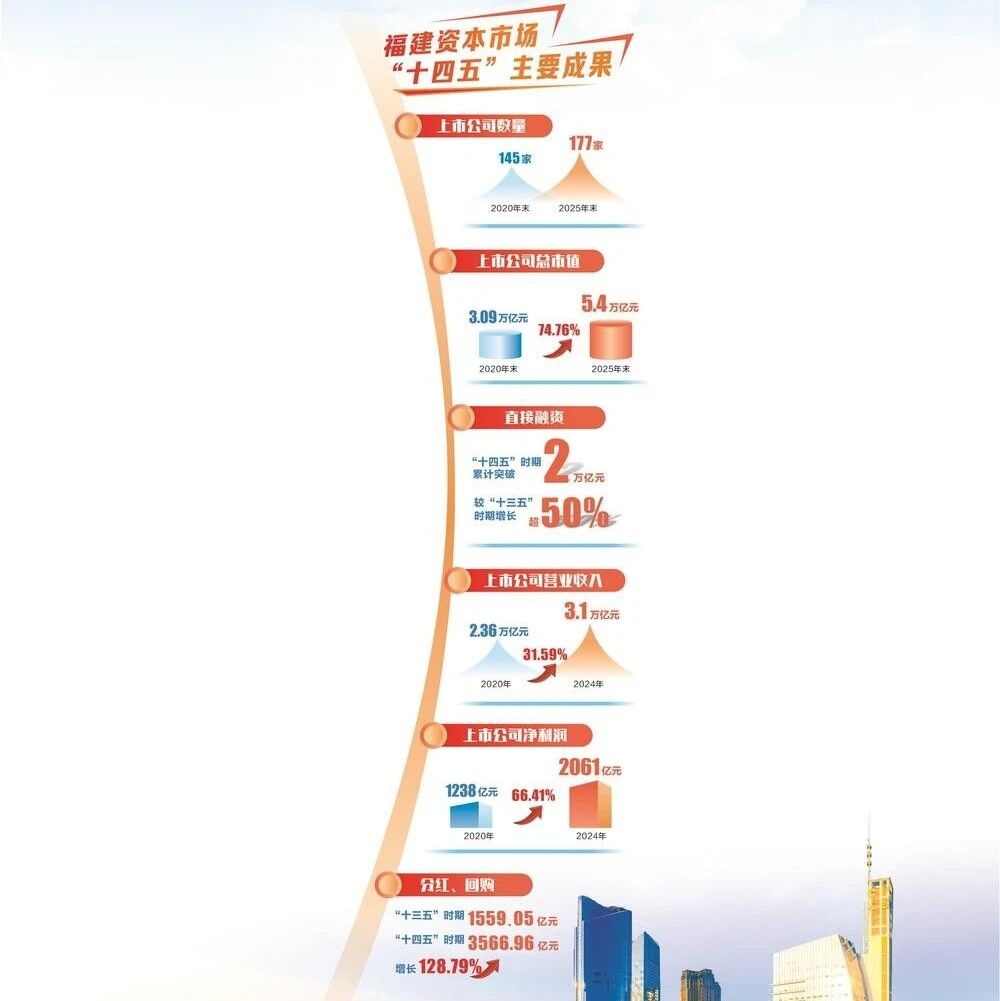 Core Viewpoint - During the "14th Five-Year Plan" period, Fujian Province's capital market has achieved remarkable growth, with direct financing exceeding 2 trillion yuan, marking over a 50% increase compared to the "13th Five-Year Plan" period, and positioning itself to lead the nation in A-share IPO financing by 2025 [1][5]. Group 1: Direct Financing and Market Growth - Fujian's capital market has seen direct financing surpassing 2 trillion yuan in the past five years, highlighting its role in supporting the real economy [5]. - By 2025, the province's direct financing is expected to reach a new high of 500 billion yuan, with A-share IPO financing at 22.446 billion yuan, ranking first in the country [6]. - The total market capitalization of listed companies in Fujian is projected to reach 5.4 trillion yuan by the end of 2025, ranking sixth nationally and reflecting a 74.76% increase from the end of the "13th Five-Year Plan" [10]. Group 2: Quality and Structure of Listed Companies - The number of listed companies in Fujian has increased to 177, with a notable improvement in the quality of these companies, as evidenced by a 31.59% increase in revenue and a 66.41% increase in net profit compared to the end of the "13th Five-Year Plan" [9][12]. - The average earnings per share reached 1.09 yuan, and the average return on equity was 10.77%, both significantly higher than the national averages [6]. Group 3: Industry Optimization and Innovation - Fujian has seen a continuous optimization of its industrial structure, with significant achievements in sectors such as computer and communication, software and information services, and electrical machinery manufacturing [10]. - The province has added 24 new technology-oriented listed companies during the "14th Five-Year Plan," with over 200 billion yuan in innovative bond issuance [15]. Group 4: Mergers, Acquisitions, and Investor Returns - Fujian's regulatory authorities have promoted mergers and acquisitions to enhance resource allocation efficiency, with 69 companies engaging in such activities, totaling 35.957 billion yuan [12]. - Cash dividends and buybacks from listed companies reached 356.7 billion yuan, a 128.79% increase from the "13th Five-Year Plan," indicating a strong focus on improving investor returns [12]. Group 5: Regulatory Measures and Risk Management - The regulatory bodies in Fujian have intensified their focus on risk management, successfully resolving issues for 22 listed companies and addressing risks in the bond market [16]. - A total of 66 cases of market violations were penalized, with fines totaling nearly 500 million yuan, reflecting a commitment to maintaining market order [16]. Group 6: Future Outlook - The Fujian Securities Regulatory Bureau plans to continue implementing new policies to enhance risk management and promote high-quality development in the capital market, aiming to inject stronger capital dynamics into the province's economic and social development [18].