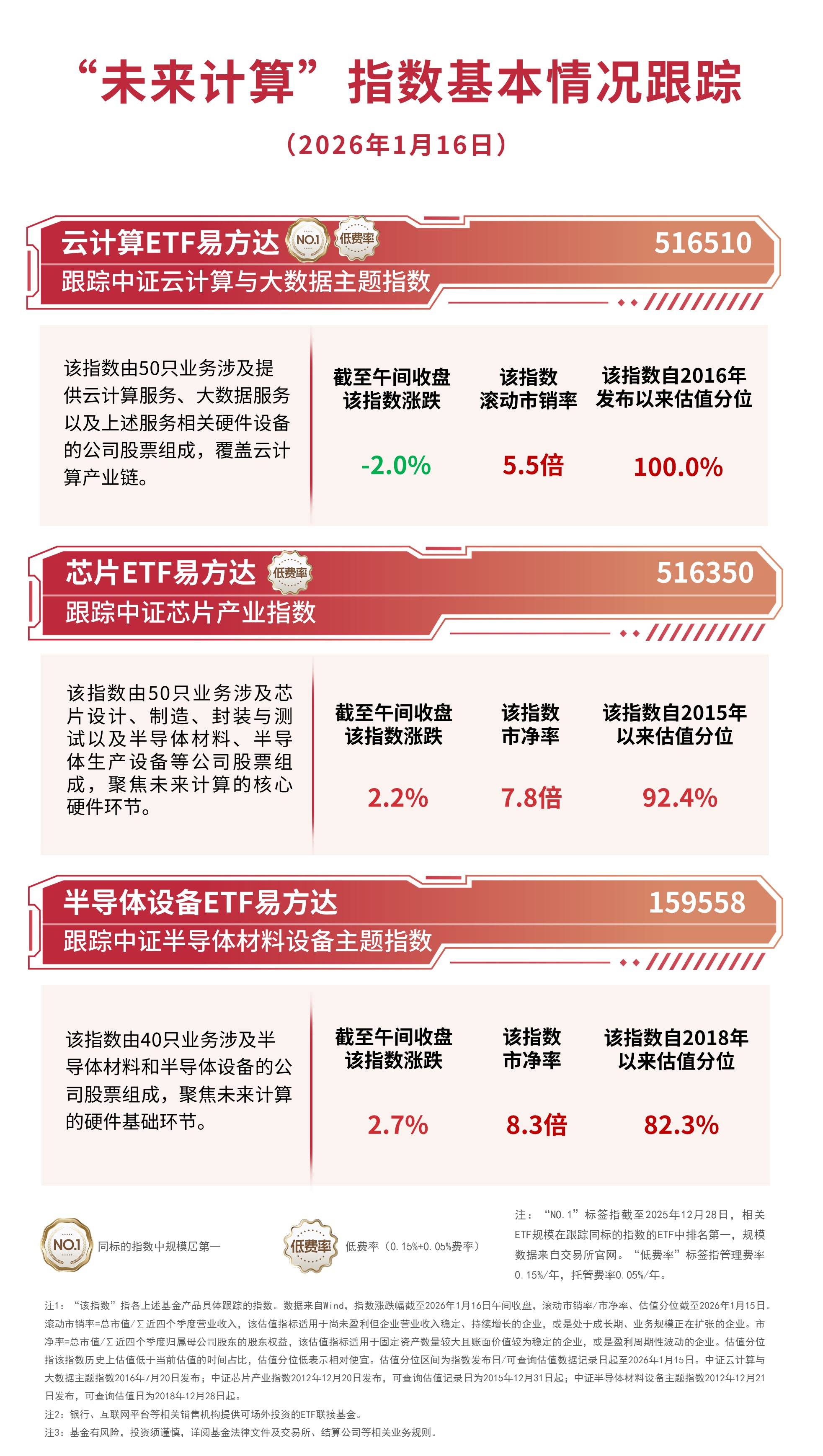 截至午间收盘,中证半导体材料设备主题指数上涨2.7%,中证芯片产业指数上涨2.2%,中证云计算与大数据主题指数下跌2.0%,半导体设备ETF易方达 (159558)半日净申购约1.8亿份。 截至午间收盘 该指数涨跌 2.7% 同标的指数中规模居第一 低费率(0.15%+0.05%幕 该指数由50只业务涉及芯 片设计、制造、封装与测 试以及半导体材料、半导 体生产设备等公司股票组 成,聚焦未来计算的核心 硬件环节。 半导体设备ETF易方达 跟踪中证半导体材料设备主题指数 该指数由40只业务涉及半 导体材料和半导体设备的公 司股票组成,聚焦未来计算 的硬件基础环节。 每日经济新闻 注1:"该指数"指各上述基金产品具体跟踪的指数。数据来自Wind,指数涨跌幅截至2026年1 截至午间收盘 该指数涨跌 2,2% ...