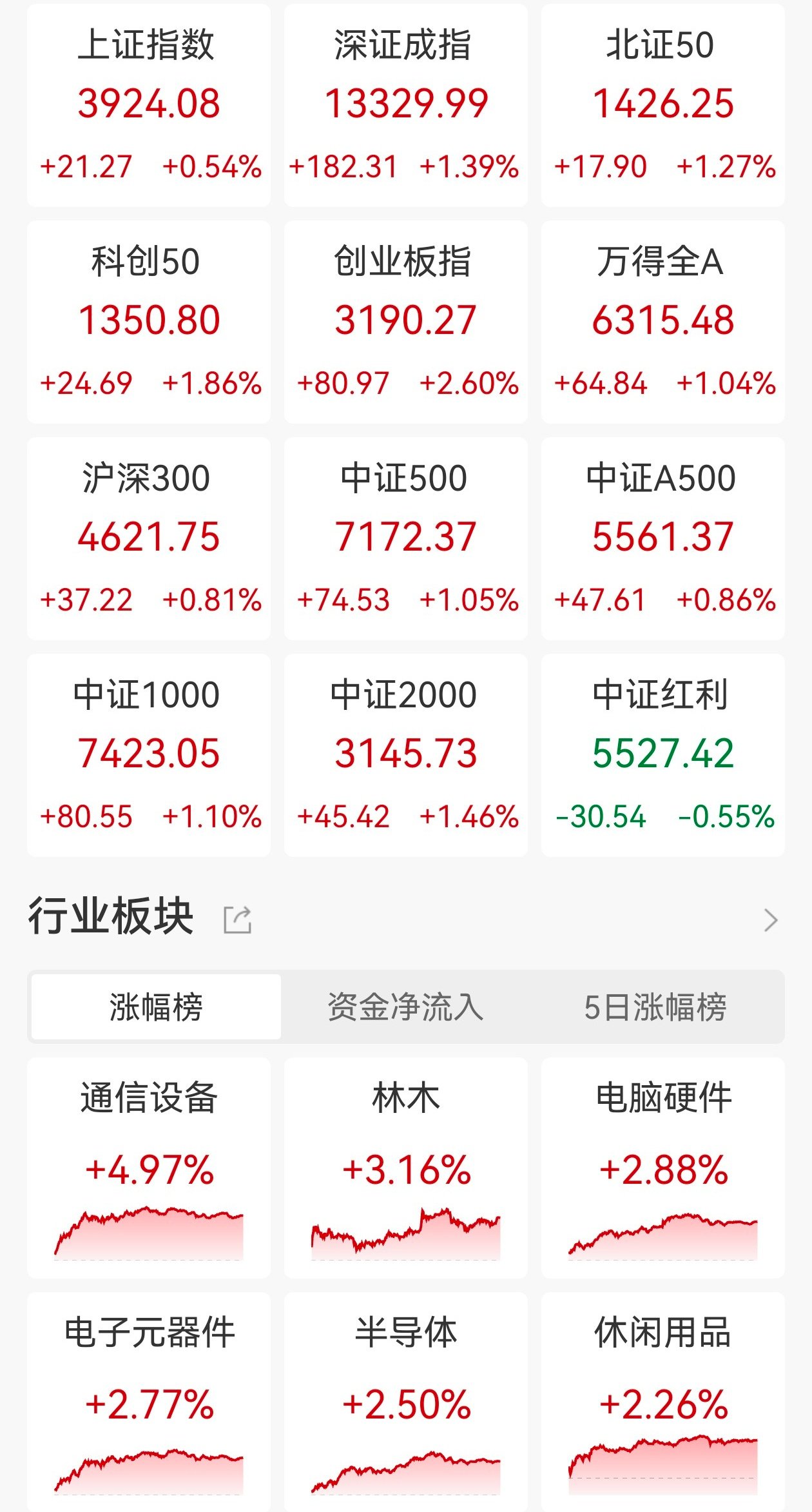 重磅会议指明年继续实施更加积极的财政政策和适度宽松的货币政策,A股三大指数今日集体走高,截至收盘,沪指涨0.54%报3924点,深证成指涨1.39%, 创业板指涨2.6%。全市场成交额2.05万亿元,较前一交易日增量3127亿元,超3400股上涨。 | 上证指数 | 深证成指 | 北证5C | | --- | --- | --- | | 3924.08 | 13329.99 | 1426.2 | | +21.27 +0.54% +182.31 +1.39% +17.90 +1 | | | | 科创20 | 创业板指 | 万得全/ | | 1350.80 | 3190.27 | 6315.4 | | +24.69 +1.86% +80.97 +2.60% +64.84 +1 | | | | 沪深300 | 中证500 | 中证A5( | | 4621.75 | 7172.37 | 5561.3 | | +37.22 +0.81% +74.53 +1.05% +47.61 +0 | | | | 中证1000 | 中证2000 | 中证红和 | | 7423.05 | 3145.73 | 5527.4 | | +8 ...