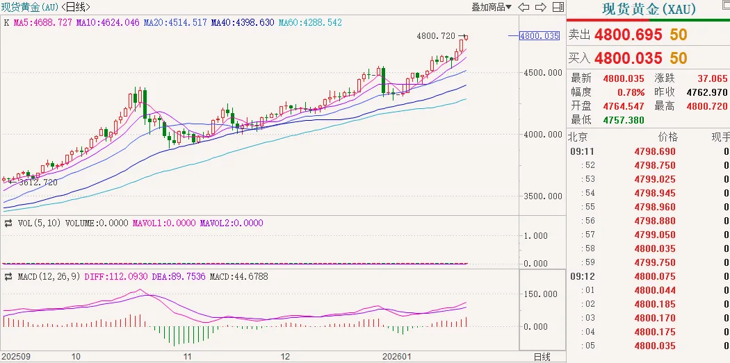 东吴期货21日早报称,近日贵金属震荡上行。一方面,美国宣称对欧洲国家加征关税,避险情绪再次升温利多贵金属;其次,鲍威尔遭到刑事起诉, 本质上看是美联储独立性再次遭到挑战,美元信用再遭打击;最后,波兰央行宣布增持黄金,另外丹麦养老基金决定抛售美债,都在一定程度上利好 黄金。后续重点关注美联储主席人选,美欧关税对峙,南美及格陵兰岛的地缘影响等。 据新华财经1月21日消息,现货黄金涨势不止,刷新纪录高点至4836.55美元/盎司,日内涨1.48%。 | 现货黄金(AU)<日线> | | 叠加商品▼ ◇ 二> ■ | | | 现货黄金(XAU) | | | --- | --- | --- | --- | --- | --- | --- | | K MA5:4688.727 MA10:4624.046 MA20:4514.517 MA40:4398.630 MA60:4288.542 | 4800. 720 | 4800.035 | | 卖出 4800.695 50 | | | | | | | | 买入 4800.035 50 | | | | | | 4500. 000 | 最新 | 4800.035 | 涨跌 | 3 ...