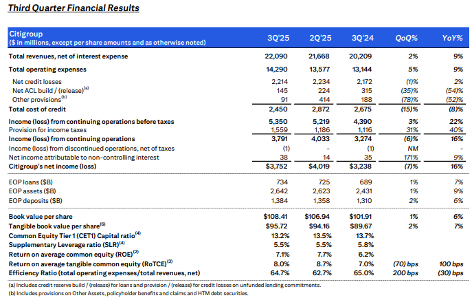 花旗银行第三季度财报表现强劲,营收221亿美元同比增长9%,更重要的是五大核心业务板块的全面发 力,均创下三季度收入纪录,反映出花旗近年来业务重组和数字化转型投资开始显现成效。 周二美股盘前,花旗发布第三季度财报,具体来看: • 财务表现亮眼:第三季度净收入221亿美元,同比增长9%;每股收益1.86美元,剔除一次 性项目后达2.24美元;ROE为7.1%,剔除一次性项目后为8.5% • 五大业务板块全面开花:服务、市场、银行、财富管理、美国个人银行均创三季度收入纪 录,显示业务转型效果显著 • 股东回报力度空前:单季度向股东返还约61亿美元,支付比率达176%;年初至今已返还 120亿美元 | Citigroup | 30,25 | 20'25 | 3Q'24 | QoQ% | YoY% | | --- | --- | --- | --- | --- | --- | | ($ in millions, except per share amounts and as otherwise noted) | | | | | | | Total revenues, net of interest expense | ...