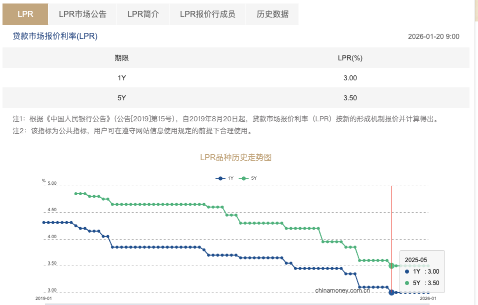 21世纪经济报道记者 唐婧 1月20日,最新贷款市场报价利率(LPR)报价出炉。其中,1年期LPR为3.00%,5年期以上LPR为3.50%,均与上月持平。这是自2025年 5月两个期限LPR各下降10个基点之后,LPR连续8个月"按兵不动"。 贷款市场报价利率(LPR)由各报价行按公开市场操作利率(公开市场7天期逆回购利率)加点形成的方式报价,由全国银行间同业拆 借中心计算得出,为银行贷款提供定价参考。加点幅度则主要取决于各行自身资金成本、市场供求、风险溢价等因素。 图片来源:中国外汇交易中心 年内LPR下调依然可期 本月LPR按兵不动的一大背景是,1月15日,中国人民银行新闻发言人、副行长邹澜在国新办新闻发布会上表示,各类结构性货币政策 工具利率0.25个百分点。各类再贷款一年期利率从目前的1.5%下调到1.25%,其他期限档次利率同步调整。这意味着,银行从中国人民 银行"借钱"将更便宜,有助于提升重点领域信贷投放的积极性,进一步助力经济结构转型优化。 考虑到结构性"降息"有助于商业银行降低负债成本,因此此前也有市场人士预计1月LPR可能下调。对此,中欧国际工商学院教授、人民 银行调查统计司原司长盛松成解 ...