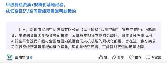 公开资料显示,作为低空无人机运营服务领域的先行者,武测空间锚定低空版星链"万链计划"核心战 略,致力于构建一张覆盖全国的低空版无人机网络——以轻量化无人机机场为低空基站、以AI低空平 台为网络中枢、以厘米级时空数据为网络血液,重塑低空空域智能运营体系。 这一战略的落地,离不开创始人及团队的硬核专业积淀:创始人张小星毕业于武汉大学测绘工程专业, 该学科连续九年位居全球排名第一。 瑞财经 吴文婷 1月15日,深圳市武测空间信息有限公司(以下简称"武测空间")宣布完成Pre-A轮融 资,本轮融资由国华投资领衔投资,云悦资本担任本轮财务顾问。 融资资金将重点用于AI低空平台迭代升级与全国范围内数百台无人机机场的规模化部署,旨在进一步 夯实公司在低空经济基建领域的核心壁垒,深化与低空经济、空间智能赛道的场景协同。 ...