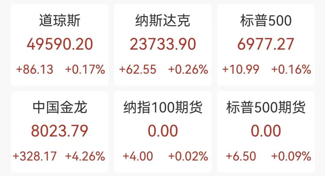 特朗普考虑限制信用卡费率,金融板块承压。 受科技股及沃尔玛上涨提振,同时投资者基本消化美国司法部对美联储主席鲍威尔发起刑事调查的相关 担忧,美股周一小幅走高。截至收盘,道指涨86.13点,涨幅0.17%,收于49590.20点,纳指涨0.26%, 收于23733.90点,标普500指数涨0.16%,收于6977.27点。道指和标普联袂创收盘新高。 【热门股表现】 明星科技股涨多跌少,甲骨文涨3.1%,谷歌涨1.1%,苹果宣布将在今年设备中应用其人工智能系统 Gemini,特斯拉涨0.9%,苹果涨0.3%,英伟达平盘,微软和亚马逊跌0.4%,Meta跌1.7%,英特尔跌 3.1%。 金融板块下跌超1%,在标普500指数各板块中领跌。美国总统特朗普宣布,将于1月20日起对信用卡年 利率设置为期一年的10%上限,受此影响,贷款机构及信用卡公司的股价承压下挫。美银跌1.2%,摩根 大通跌1.4%,花旗跌近3%,美国运通跌4.2%。 沃尔玛涨3%,市场对其即将纳入纳斯达克 100 指数的热情是股价走高的主要推手。 中概股爆发,纳斯达克中国金龙指数涨4.2%。阿里巴巴涨10.1%,百度涨6.0%,京东和网易涨超4%。 【 ...