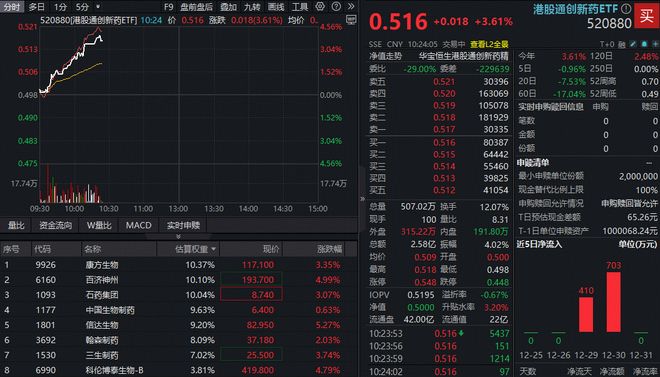 2026年1月5日,港股通创新药板块全线走高,龙头股普涨,百济神州涨近5%,信达生物涨超5%,康方生物、石药集团涨超3%。 高弹性港股通创新药ETF(520880)开盘后持续拉升,一度涨逾4%,场内放量成交2.58亿元,已超上一交易日全天。 | | 多日 1分 5分 ▼ | | | Ed | | 盘前盘后 叠加 九转 画线 工具 | | 6 0 % | | | | | 港股通创新药自日 0 | | | | --- | --- | --- | --- | --- | --- | --- | --- | --- | --- | --- | --- | --- | --- | --- | --- | | 0.521 | | | | 520880[港股通创新药ETF] 10:24 价 0.516 涨跌 0.018(3.61%) 均价 | | | | 5696 | | 0.516 +0.018 +3.61% | | | 520880 | | | | 0.513 | | | | | | | | 3.04% | | SSE CNY 10:24:05 交易中 查看L2全景 | | | | T+0 融 + + | | | | ...