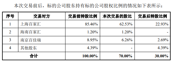 标的公司去年营收净利双降。2023年度、2024年度、2025年1至7月,标的公司营业收入分别为 65,289.15万元、58,234.95万元、22,762.09万元,净利润/归属于母公司股东的净利润分别为21,042.53万 元、18,013.61万元、5,967.95万元。 中国经济网北京11月14日讯 利德曼(300289.SZ)昨晚披露的重大资产购买报告书(草案)显示,上 市公司拟向上海百家汇、海南百家汇、南京百佳瑞支付现金对价收购其所合计持有的先声祥瑞70%股 份。本次交易完成后,上市公司将直接持有先声祥瑞70%股份,取得其控股权,并将标的公司纳入合并 报表范围。 | 序号 | 交易对方 | 交易前持股比例 | 本次交易的股比 | 交易后持股比例 | | --- | --- | --- | --- | --- | | 1 | 上海百家汇 | 85.46% | 62.53% | 22.93% | | 2 | 海南白家汇 | 1.20% | 1.20% | | | 3 | 南京百佳瑞 | 8.95% | 6.26% | 2.69% | | ব | 其他股东 | 4.39% | | 4.39% | | ...