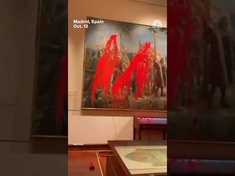 Climate activists vandalize Christopher Columbus painting on Spain's National Day