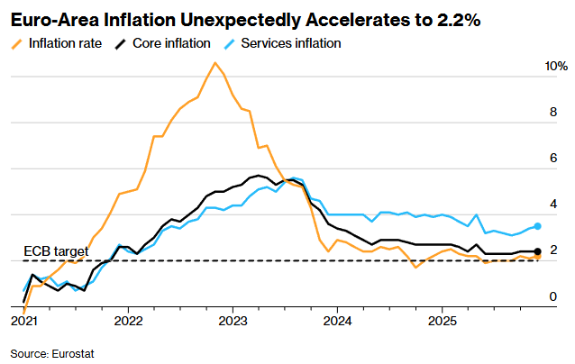 智通财经APP获悉,欧元区11月通胀率小幅上涨,这支持了欧洲央行的观点,即目前几乎没有理由进一 步降低借贷成本。周二公布的数据显示,欧元区11月CPI同比上涨2.2%,高于经济学家预测中值2.1%和 前值2.1%;剔除波动较大的食品和能源价格的核心CPI同比涨幅持平于2.4%,与经济学家预测中值一致; 备受关注的服务业通胀则略有上升。 投资者和经济学家对此表示认同。他们预计,欧洲央行本月将再次将存款机制利率维持在2%不变。此 前,该行已连续八次以25个基点的幅度降息,将存款机制利率从4%的峰值一路下调。 在经历疫情后的飙升后,欧元区通胀率已连续九个月接近欧洲央行设定的2%目标水平。不过,受各国 经济状况差异及基数效应影响,欧元区各成员国之间的通胀情况差异较大——德国通胀加速,法国通胀 保持稳定,西班牙和意大利的通胀则有所缓解。 欧洲央行行长拉加德上周强调了该行对当前货币政策立场的满意态度。拉加德表示:"考虑到我们已经 成功控制住的通胀周期,我们处于有利位置"。她还补充称,利率"设定得当"。 通胀前景温和加之经济复苏势头增强,促使大多数分析师预测欧洲央行基准利率将在2026年之前保持不 变。与此同时,面对贸易和 ...