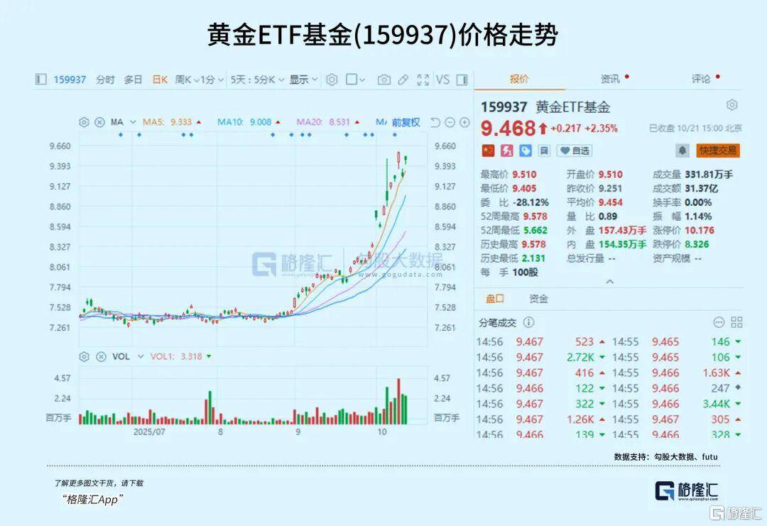 Core Insights - Since 2025, international gold prices have surged significantly, surpassing expectations set by major investment banks like Goldman Sachs, with prices nearing $4500 per ounce [1][3] - The gold ETF has seen a remarkable year-to-date increase of over 59%, outperforming many other asset classes [1][10] - Despite recent volatility due to geopolitical events and economic factors, the demand for gold assets remains strong, indicating a bullish sentiment in the market [3][14] Gold Market Performance - As of October 21, 2025, international gold futures closed at $4398 per ounce, marking a 3.82% increase [6] - The SPDR Gold Trust (GLD) saw a net inflow of $40.81 billion, making it one of the most actively traded assets in the U.S. stock market [9] - In the domestic market, gold-themed ETFs have grown from 730.53 billion yuan at the beginning of the year to 2361.31 billion yuan, reflecting a 223% increase [10] Individual Stock Performance - Nearly 20 gold-related stocks in the A-share market have doubled in value this year, with Zijin Mining's market capitalization increasing by 105.6% to nearly 800 billion yuan [12] - Specific stocks such as Zhaojin Mining and Western Gold have shown significant price increases, with Zhaojin Mining's price rising by 241.81% [13] Factors Driving Gold Prices - Recent geopolitical tensions, including the Russia-Ukraine conflict and U.S. government shutdown, have heightened market volatility, leading to increased demand for gold as a safe-haven asset [14][15] - The expectation of further interest rate cuts by the Federal Reserve has also contributed to the bullish outlook for gold, with a 99% probability of a rate cut next week [14][15] Central Bank Trends - Global central banks have been increasing their gold reserves, with a reported value of approximately $4.5 trillion, surpassing U.S. Treasury holdings [17] - China's central bank has consistently increased its gold reserves, reaching 7406 million ounces as of September 2025 [19] Investment Opportunities - Analysts predict that gold prices could reach $5000 per ounce by 2026, indicating potential for further appreciation [20] - For ordinary investors, gold ETFs are recommended as a convenient and low-risk method to gain exposure to gold, with the SPDR Gold ETF being a notable example [21][22]