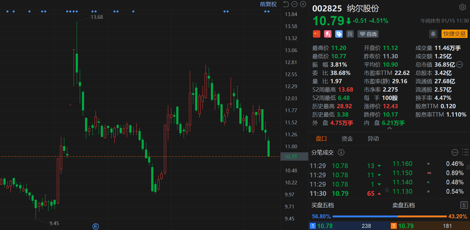 同日公告显示,纳尔股份披露定增预案,公司拟向杨建堂、上海纳隽材料科技中心(有限合伙)等发行股份及支付现金,购买南通纳尔33.55%股权并募集配套 资金,此次交易的价格尚未确定。此次交易后,上市公司将持有南通纳尔100%的股权。 消息上,纳尔股份昨日晚公告称,经过多轮沟通,各方在核心合作安排上仍未形成一致意见。基于当前实际情况,经各方友好协商后,一致同意终止收购协 议。公司筹划通过收购上海菲莱测试技术有限公司,进军半导体赛道的计划,最终还是宣布放弃。 纳尔股份(002825.SZ)午间收跌4.5%报10.79元,股价创2025年11月底以来新低,总市值36.85亿元。 ...