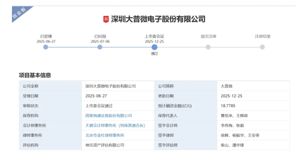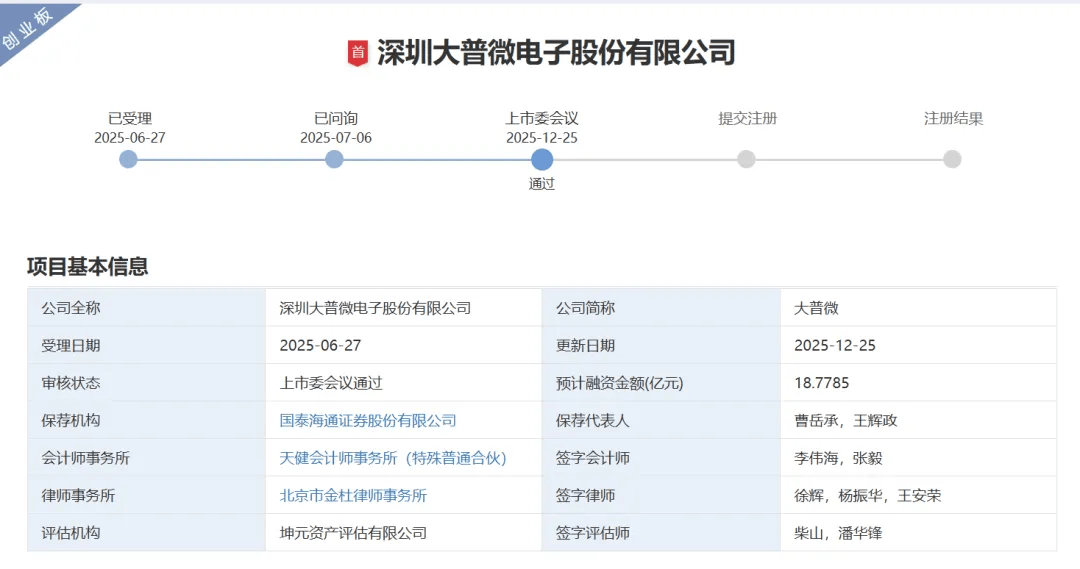 12月25日,深交所上市委审议通过深圳大普微电子股份有限公司(以下简称"大普微")IPO申请,标志着创业板首家未盈利企业成功过会。 创业板积极服务科技创新 | 公司全称 | 深圳大普微电子股份有限公司 | 公司简称 | 大昔微 | | --- | --- | --- | --- | | 受理日期 | 2025-06-27 | 更新日期 | 2025-12-25 | | 审核状态 | 上市委会议通过 | 预计融资金额(亿元) | 18.7785 | | 保存机构 | 国泰海通证券股份有限公司 | 保存代表人 | 曹岳承,王辉政 | | 会计师事务所 | 天健会计师事务所(特殊普通合伙) | 签字会计师 | 李伟海,张毅 | | 律师事务所 | 北京市金杜律师事务所 | 签字律师 | 徐辉,杨振华,王安荣 | | 评估机构 | 坤元资产评估有限公司 | 签字评估师 | 柴山,潘华锋 | 公开资料显示,大普微主要从事数据中心企业级SSD(固态硬盘)产品的研发和销售,是业内领先、国内极少数具备企业级SSD"主控芯片+固件算法+模 组"全栈自研能力并实现批量出货的半导体存储产品提供商。 业内人士认为,此次大普微IPO过 ...