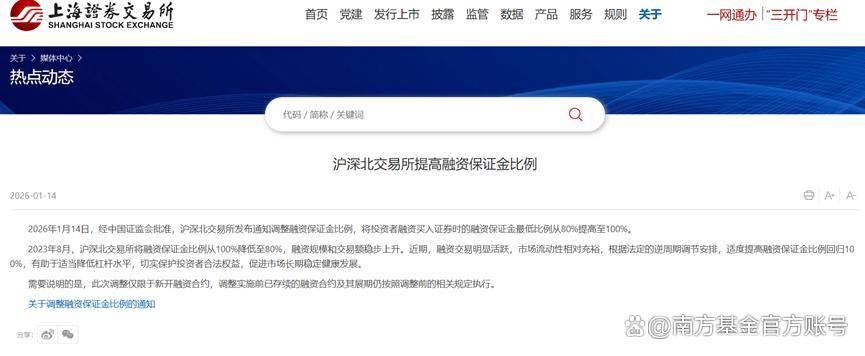 最近一则融资账户新规,让不少习惯使用融资账户的朋友心里微微一紧。 昨日行情也急速降温,成交量直接缩至3万亿以下,成长风格板块调整幅度较大。(数据来源:wind,20260115) 1月14日,经中国证监会批准,沪、深、北三大交易所发布通知,将投资者融资买入证券时的最低保证金比例,从80%提高 到了100%,这项调整从下周一(1月19日)起正式施行。 图片来源:上交所 消息一出,很多人的第一反应可能是:市场刹车了,这轮行情会就此结束吗?今天我们就来聊聊这件事。 01 什么是保证金比例? 首先,我们先弄懂一个关键概念:什么是"保证金比例"? 在股票交易中,保证金通常指的是投资者进行融资融券、股指期货、期权等杠杆交易时,需要预先缴纳的一部分资金,作 为履约担保。而"保证金比例"调整,直接决定了你能向券商借多少钱。 具体而言,在调整前,投资者只需投入80万元保证金,即可融得100万元资金用于证券买入,实际杠杆率可达1.25倍;调整 后,若想融得相同额度的100万元资金,投资者需足额缴纳100万元保证金,杠杆率从1.25倍回落至1倍。 这其实是监管层进行"逆周期调节"的常规操作。我们可以把它理解为监管手中的一个调节器, ...
