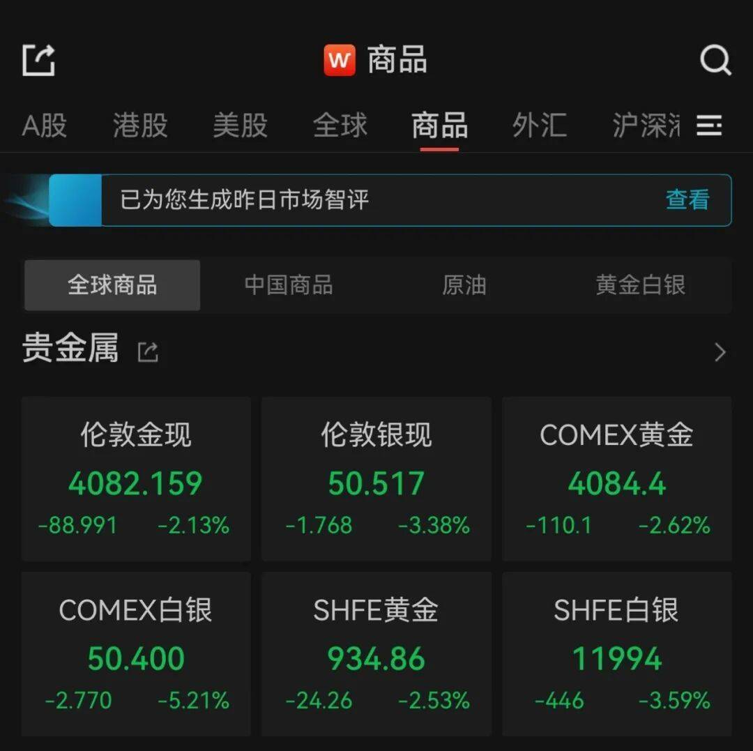 11月14日晚间,金价、银价突然大跳水。 现货黄金价格一度大跌3.21%, 截至11月15日7时10分,跌幅收窄至2.13%,报4082.159美元/盎司;期货黄金跌幅为2.62%,报 4084.4美元/盎司。 | 14 | | w 商品 | | | --- | --- | --- | --- | | A股 港股 | 美股 全球 | 商品 | 外汇 沪深汽三 | | 已为您生成昨日市场智评 | | | 查看 | | 全球商品 | 中国商品 | 原油 | 黄金白银 | | 贵金属 広 | | | | | 伦敦金现 | | 伦敦银现 | COMEX黄金 | | 4082.159 | | 50.517 | 4084.4 | | -88.991 -2.13% | | -1.768 -3.38% | -110.1 -2.62% | | COMEX自银 | | SHFE黄金 | SHFE自银 | | 50.400 | | 934.86 | 11994 | | -2.770 -5.21% | | -24.26 -2.53% -446 -3.59% | | 近期,世界黄金协会发布2025年三季度《全球黄金需求趋势报告》显示, ...