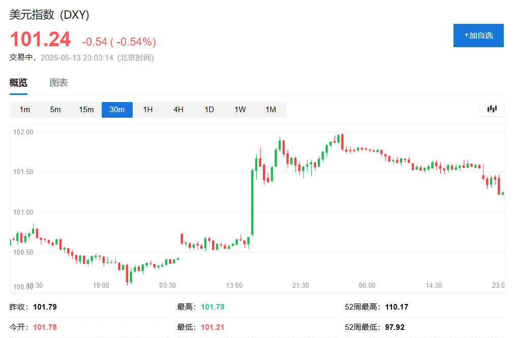 美元指数DXY短线下挫近20点,日内走低0.5%,现报101.30。 ...