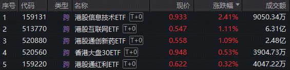 周四(12月4日),港股、A股中国科技资产集体回升,港股表现相对亮眼。此前,外资机构扎堆唱多 中国科技。 港股盘面上,芯片产业链携手走强,全市场首只聚焦"港股芯片"的港股信息技术ETF(159131)放量大 涨2.41%;港股AI核心工具——港股互联网ETF(513770)、创新药含量100%的港股通创新药ETF (520880)场内放量携手涨超1%。 | 序号 代码 | | 类型 名称 | 现价 | 涨跌幅 ▼ | 成交额 | | --- | --- | --- | --- | --- | --- | | 1 | 159131 | 跨 港股信息技术ETF T+0 | 0.933 | 2.41% | 9050.34万 | | 2 | 513770 | 跨 港股互联网ETF T+0 | 0.547 | 1.11% | 6.31亿 | | 3 | 520880 | 跨 港股通创新药ETF T+0 | 0.558 | 1.09% | 2.48亿 | | 4 | 520560 | 跨 香港大盘30ETF T+0 | 0.948 | 0.53% | 3904.73万 | | 55 | 159220 | 跨 港股通红利E ...