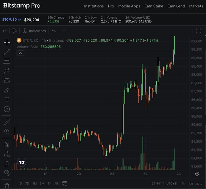 4月22日,Bitstamp报价显示,比特币重新站上9万美元/枚,现报90204美元/枚,日内涨逾3%。 ...