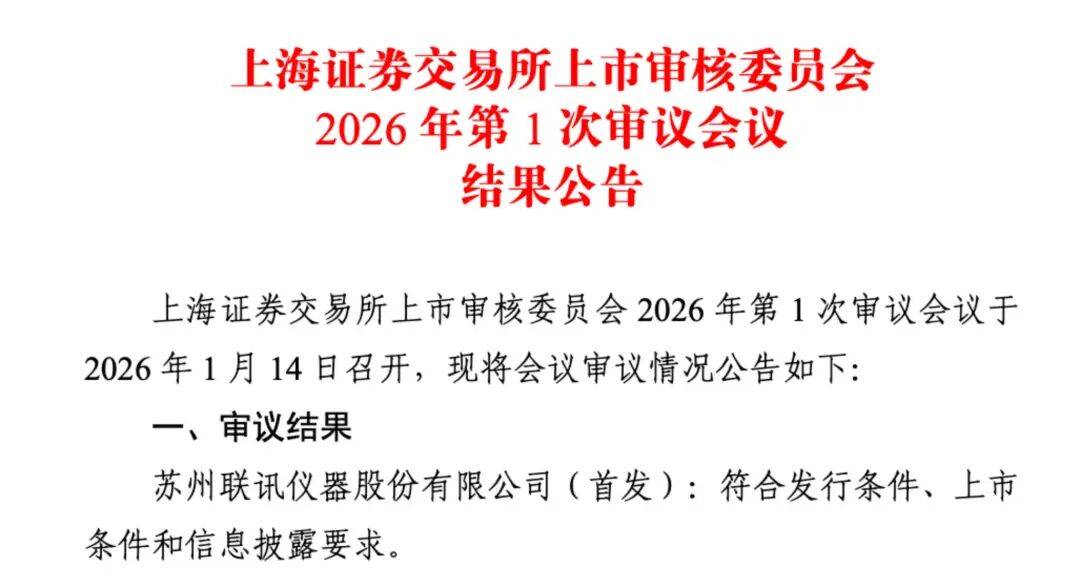 上交所上市审核委员会今年首场审议会议召开,联讯仪器科创板IPO过会。 1月14日,上交所上市审核委员会召开2026年第1次上市审核委员会审议会议,审议苏州联讯仪器股份有限公司(简称"联讯仪器")首发事项,最终公司顺 利过会。 联讯仪器是国内领先的高端测试仪器设备企业,主营业务为电子测量仪器和半导体测试设备的研发、制造、销售及服务,专业为全球高速通信和半导体等 领域用户提供高速率、高精度、高效率的核心测试仪器设备,助力人工智能、新能源、半导体等前沿科技行业提升产品开发和量产效率。 联讯仪器构建了以高速信号处理、微弱信号处理和超精密运动控制为核心的平台级核心技术体系,掌握了低损耗低噪声高速信号电路设计、超微弱信号产 生与测量等16项核心技术,覆盖材料配方、加工工艺、产品结构等多个维度。在电子测量仪器领域,公司突破了海外企业在高速光模块测试仪器的垄断, 成为全球第二家量产1.6T光模块全部核心测试仪器的厂商;在半导体测试设备领域,公司产品全面覆盖光电子器件、功率器件、半导体集成电路等核心场 景,多个细分市场份额稳居国内第一。 市场地位的持续提升让联讯仪器在国产替代进程中占据主导地位。根据Frost&Sullivan ...