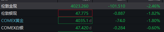 金价巨震。 北京时间10月22日晚间,国际金价再度大跌,截至发稿,伦敦金现跌2.46%至4023美元/盎司。 | 伦敦金现 | 4023.260 | -101.510 | -2.46% | | --- | --- | --- | --- | | 伦敦银现 | 47.775 | -0.887 | -1.82% | | COMEX黄金 | 4035.1 d | -74.0 | -1.80% | | COMEX白银 | 47.420 d | -0.284 | -0.60% | 此前一个交易日,国际金价出现大跌行情,当天伦敦金现价格暴跌超过5%,单日每盎司下跌超过200美元,盘中价格一度跌破4100美元/盎司。 华西证券(002926)指出,近期支撑贵金属等避险资产走强的宏观风险因素正显现出缓和迹象:一是中美关系出现边际改善信号;二是俄乌冲突方面,法 国等欧洲多国领导人联合呼吁以现有战线为基础启动停火谈判,地缘紧张局势有所降温;三是伦敦白银租赁利率显著回落,显示前期极端逼仓情绪部分缓 解。若上述风险持续缓和,短期内或面临一定回调压力。 光大期货贵金属资深研究员展大鹏表示,俄乌局势出现重大转折,是黄金大跌的直接原因。乌 ...