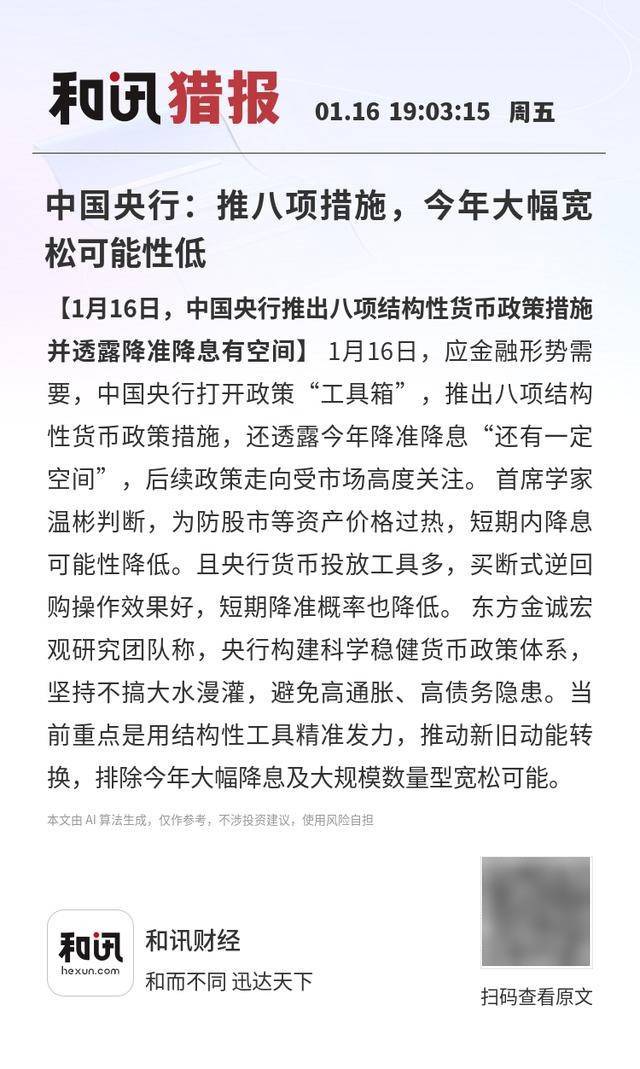 【1月16日,中国央行推出八项结构性货币政策措施并透露降准降息有空间】1月16日,应金融形势需 要,中国央行打开政策"工具箱",推出八项结构性货币政策措施,还透露今年降准降息"还有一定空 间",后续政策走向受市场高度关注。首席学家温彬判断,为防股市等资产价格过热,短期内降息可能 性降低。且央行货币投放工具多,买断式逆回购操作效果好,短期降准概率也降低。东方金诚宏观研究 团队称,央行构建科学稳健货币政策体系,坚持不搞大水漫灌,避免高通胀、高债务隐患。当前重点是 用结构性工具精准发力,推动新旧动能转换,排除今年大幅降息及大规模数量型宽松可能。 For hexun.com 本文由 AI算法生成,仅作参考,不涉投资建议,使用风险自担 和讯财经 和而不同 迅达天下 扫码查看原文 ...