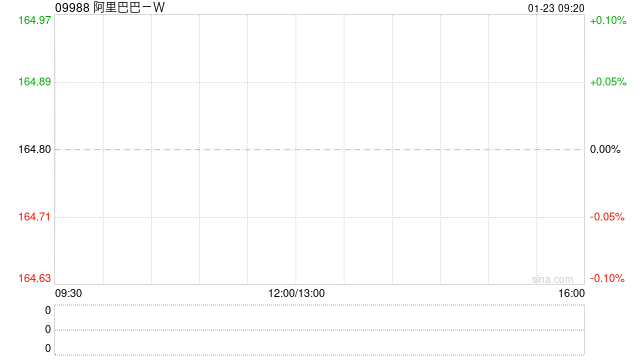 1月23日消息,阿里巴巴-W(9988.HK)高开3.88%报171.2港元,成交额逾8亿港元。隔夜美股市场阿里 巴巴收涨5%报177.18美元。 | 09988 阿里巴巴-W | | | | --- | --- | --- | | 171.200 + +6.400 +3.88% | | 一行升盘 01/23 09:20 | | * 2 × 5 × 9 × | | ● 快捷交易 | | 最高价 171.200 | 开盘价 171.200 | 成交量 476.05万 | | 最低价 171.200 | 昨收价 164.800 | 成交额 8.11亿 | | 平均价 170.352 | 市德图TM 23.80 | 总市值 3.27万亿 (m) | | 振 幅 -- | 市盈态(静) 23.31 | 总股本 190.99亿 | | 换手率 0.03% | 市净率 2.891 | 流通值 3.27万亿 | | 52周最高 186.200 | 委 比 -4.81% | 流通股 190.99亿 | | 52周最低 84.149 | 量 比 -- | 每 手 100股 | | 历史最高 304.852 | 股息TTM 1. ...