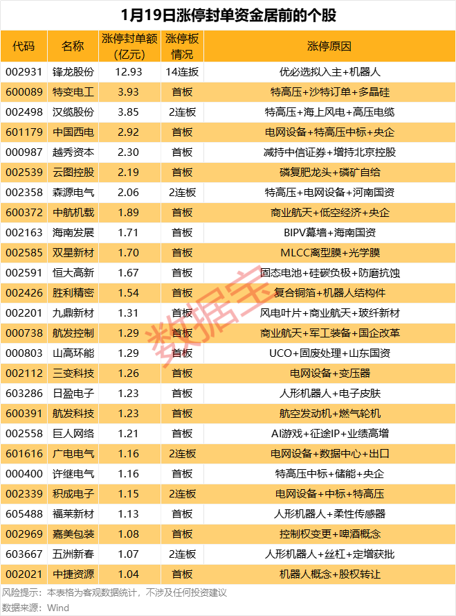 以封单金额计算,锋龙股份、特变电工、汉缆股份等涨停板封单资金居前,分别有12.93亿元、3.93亿 元、3.85亿元。 从封单力度(封单量占流通A股比例)来看,恒大高新、锋龙股份、天地在线等力度较大,分别为 9.66%、9.45%、4.08%。 | | | | 1月19日涨停封单资金居前的个股 | | | --- | --- | --- | --- | --- | | 代码 | 名称 | 涨停封单额 | 涨停板 | 涨停原因 | | | | (亿元) | 情況 | | | 002931 | 锋龙股份 | 12.93 | 14连扳 | 优必选拟入主+机器人 | | 600089 | 特变电工 | 3.93 | 首板 | 特高压+沙特订单+多晶砖 | | 002498 | 汉缆股份 | 3.85 | 2连板 | 钱书记吧+世这山奥+话题学 | | 601179 | 中国西电 | 2.92 | 首板 | 电网设备+特高压中标+央企 | | 000987 | 越秀资本 | 2.30 | 自恢 | 减持中信证券+增持北京控股 | | 002539 | 云图控股 | 2.19 | 首板 | 磷复肥龙头+磷矿自给 | | ...
