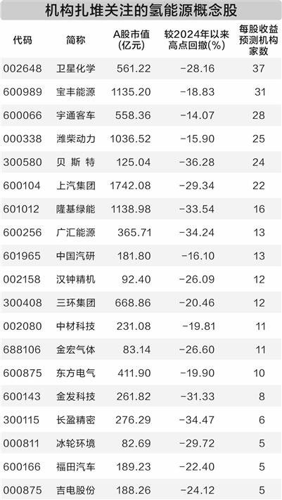 | | | 机构扎堆关注的氢能源概念股 | | | | --- | --- | --- | --- | --- | | 代码 | 简称 | A股市值 (亿元) | 较2024年以来 高点回撤(%) | 每股收益 预测机构 | | | | | | 家数 | | 002648 | 卫星化学 | 561.22 | -28.16 | 37 | | 686009 | 宝丰能源 | 1135.20 | -18.83 | 31 | | 600066 | 宇通客车 | 558.36 | -14.07 | 28 | | 000338 | 潍柴动力 | 1036.52 | -15.90 | 25 | | 300580 | 贝斯特 | 125.04 | -36.28 | 24 | | 600104 | 上汽集团 | 1742.08 | -29.34 | 22 | | 601012 | 降基绿能 | 1138.98 | -33.54 | 16 | | 600256 | 广汇能源 | 365.71 | -34.24 | 13 | | 601965 | 中国汽研 | 181.80 | -16.10 | 13 | | 002158 | 汉 ...