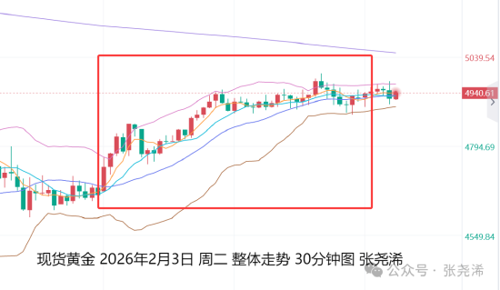 2月4日:上交易日周二(2月3日):国际黄金延续周一触底回升之力,反弹走强收阳,重回中轨上方, 多头动力加强,不过,仍需进一步运行在5日均线上方才能加大看涨前景,进一步刷新高点,否则仍面 临震荡调整的预期,不过目前看,继续反弹走强的概率较大,操作还是低多为主。 具体走势上,金价自亚市高开于4667.81美元/盎司,并先行录得日内低点4665.67美元,之后持续反弹回 升,延续到美盘次日0点时段录得日内高点4992.95美元,最后有所遇阻,并陷入窄幅盘整,最终收于 4935.80美元,日振幅327.28美元,收涨267.99美元,涨幅5.74%。 影响上,受周一触底回升的买盘力量推动,以及美伊会谈前再起摩擦,地缘局势再度紧张,再加上美联 储理事米兰:今年需降息略高于一个百分点等,整体使基本面转强,助力金价攀升收阳。 展望今日周三(2月4日):国际黄金开盘,多头动力有所减弱,受到短期均线的阻力压制,有所获利了 结,以及特朗普签署法案以结束政府部分停摆,减弱了避险需求,但金价目前已重回布林带中轨等关键 支撑上方,多头已占据优势,故此,后市行情,要么是震荡,要么是继续走强,进一步继续走低的概率 较小。 日内将可关注美 ...