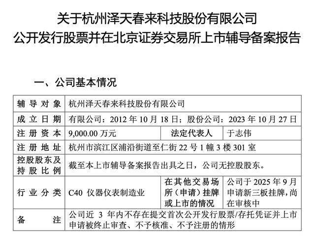 | 辅 导 对 象 杭州泽天春来科技股份有限公司 | | | --- | --- | | 有限公司:2012年10月18日;股份公司:2023年10月27日 | 成立日期 | | 注册资本 | 9,000.00 万元 法定代表人 于志伟 | | 注册地址 | 杭州市滨江区浦沿街道至仁街22号1幢3楼301室 | | 持股比例 | 控股股东及 截至本上市辅导备案报告出具之日,公司无控股股东。 | | 在其他交易场 | 公司于 2025年9月 行 业 分 类 C40 仪器仪表制造业 | | 申请新三板挂牌,尚 | 所(申请)挂牌 | | 或上市的情况 | 在审核中 | | 各 | 公司近 3 年内不存在提交首次公开发行股票/存托凭证并上市 汗 申请被终止审查、不予核准、不予注册的情形 | 本次IPO的辅导机构为国金证券股份有限公司,律师事务所为浙江天册律师事务所,会计师事务所为天 健会计师事务所(特殊普通合伙)。 瑞财经 吴文婷1月20日,杭州泽天春来科技股份有限公司(以下简称"泽天春来")启动IPO,拟登陆北 交所。 | 辅导协议签 2025 年 11月 7日 署 时 | 间 | | --- | --- | | ...