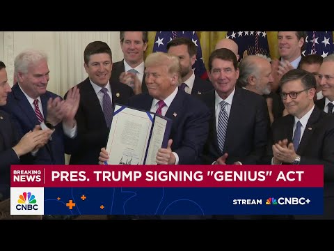We're going to go back into the signing where President Trump is signing this Genius Act right now, which is a big scandal. If that were a Republican, it would really be a big scandal, but it is one of the great scandals of our time. Thank you very much, everybody.All right, that was President Trump signing the Genius Act. Uh something he has called a giant step in a massive validation for the industry. Coinbase's CEO will discuss the impact of the crypto bills.uh that they will have on his company and the ...