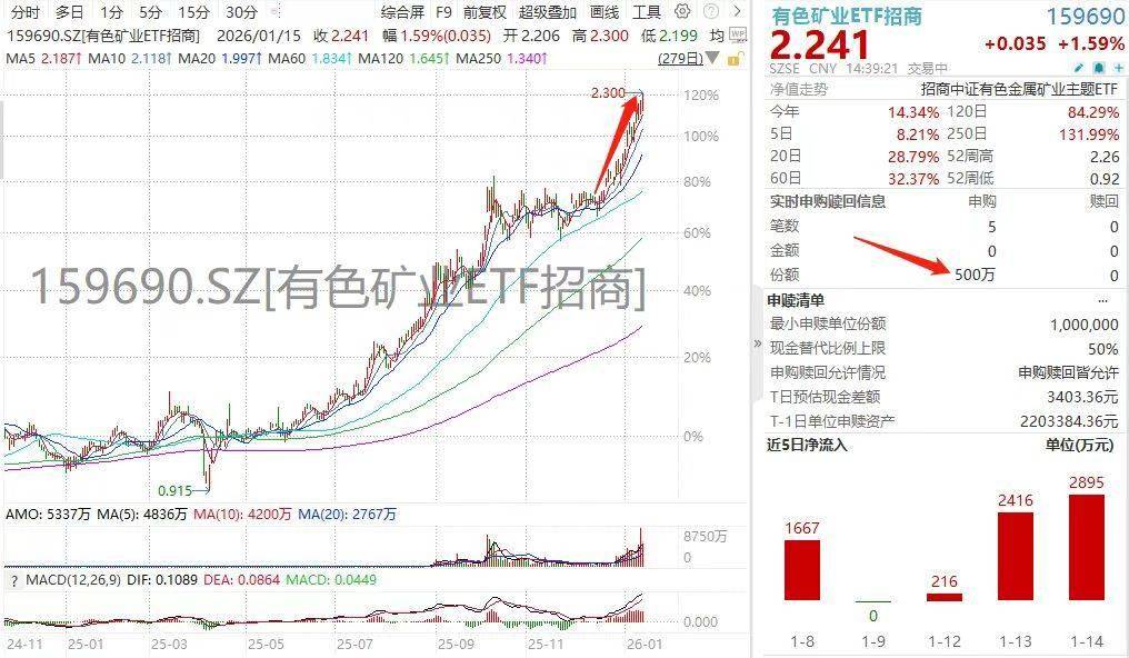 世界黄金协会(WGC)表示,从技术角度来看,黄金当前尚未被超买,只有当金价突破4770美元/盎司时,才会进入显著超买区间。 作为聚焦上游资源领域的投资工具,矿业ETF(159690)覆盖金银铜锂稀土等多种战略性资源,前三大权重品种占比近六成。该ETF通过集中投资 上游资源龙头,在有色金属价格上涨时展现出显著的价格弹性,净值涨幅往往数倍于商品本身,被誉为"周期放大器"。随着全球制造业周期企稳 回升,以及新能源、人工智能等新兴产业对上游资源的需求持续增长,矿业板块的中长期投资价值值得重点关注。风险提示:基金有风险,投资 需谨慎。 1月15日,有色板块逆势起舞。数据显示,截至14时40分,"周期放大器"有色矿业ETF招商(159690)涨1.59%,盘中创年内第8次新高;成分股华友 钴业、湖南白银、中钨高新涨幅居前。盘中净流入1100万。 ...